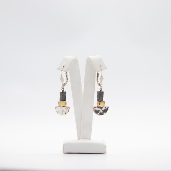 Silver earrings are combined with gold plated silver and oxidized silver. The jewelry is handmade by an Israeli artist and a highly regarded sculpture.