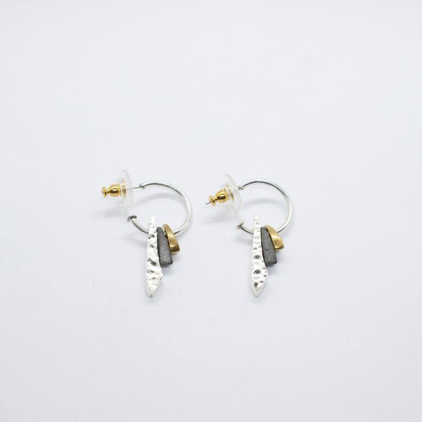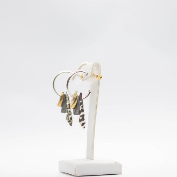Silver earrings are combined with gold plated silver and oxidized silver. The jewelry is handmade by an Israeli artist and a highly regarded sculpture.