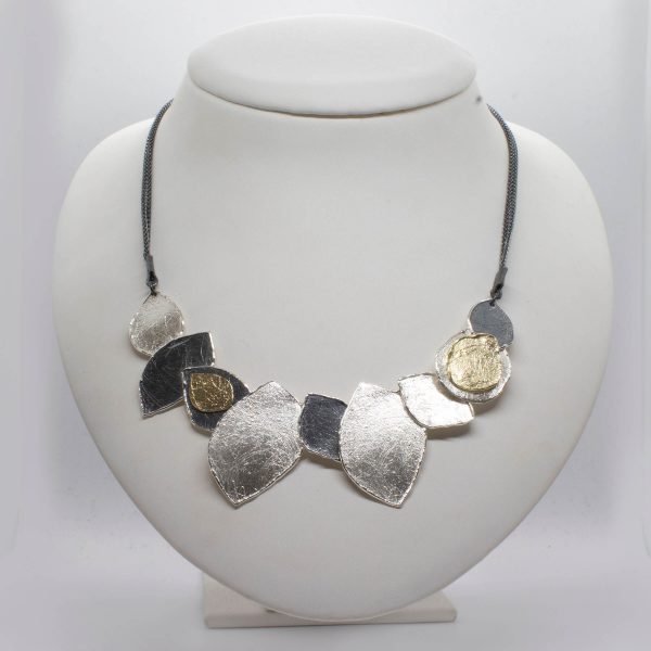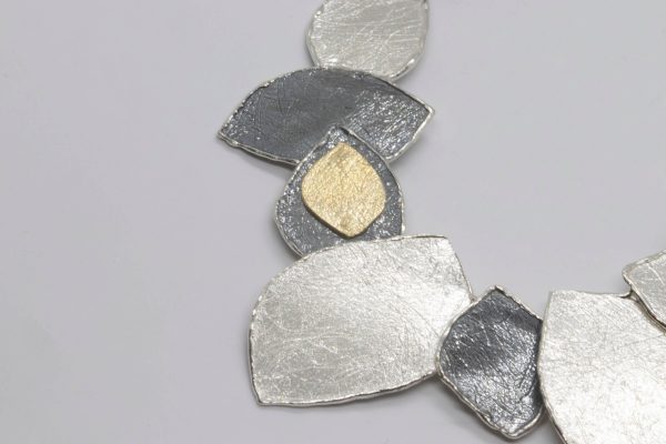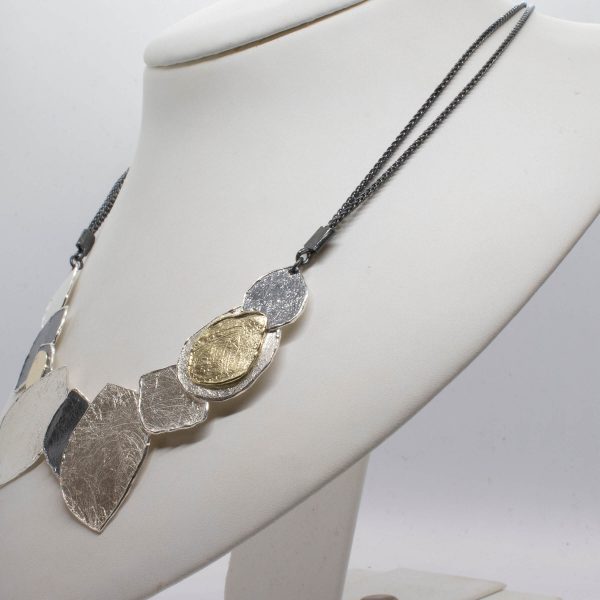 sterling silver necklace with gold plated piece and oxidized silver piece.