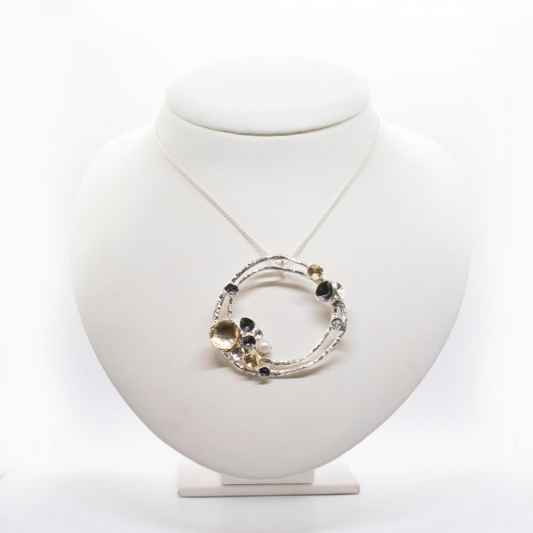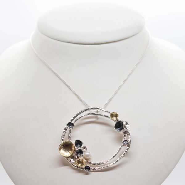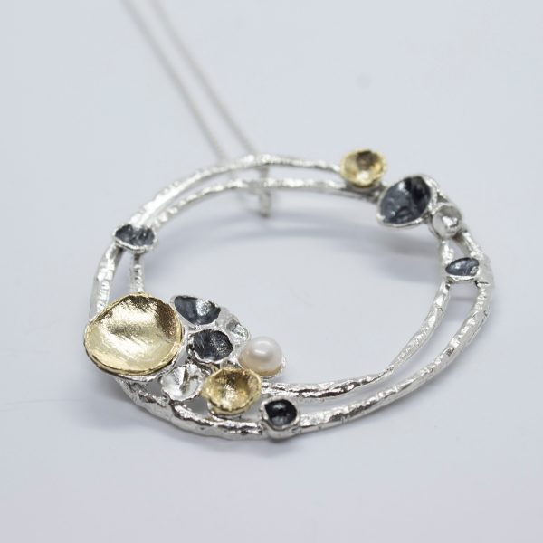 sterling silver necklace with gold plated piece and oxidized silver piece.